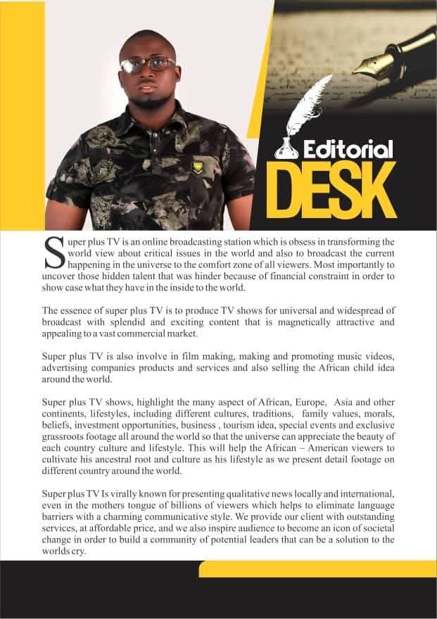 Super Plus TV Magazine is a dynamic media and promotional platform dedicated to showcasing musicians, businesses, brands, products, and services to a wider audience. Our goal is to provide visibility and recognition to talented individuals, entrepreneurs, and companies by giving them a platform where their work, achievements, and offerings can be seen and appreciated.